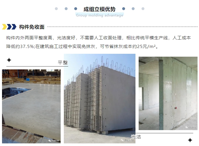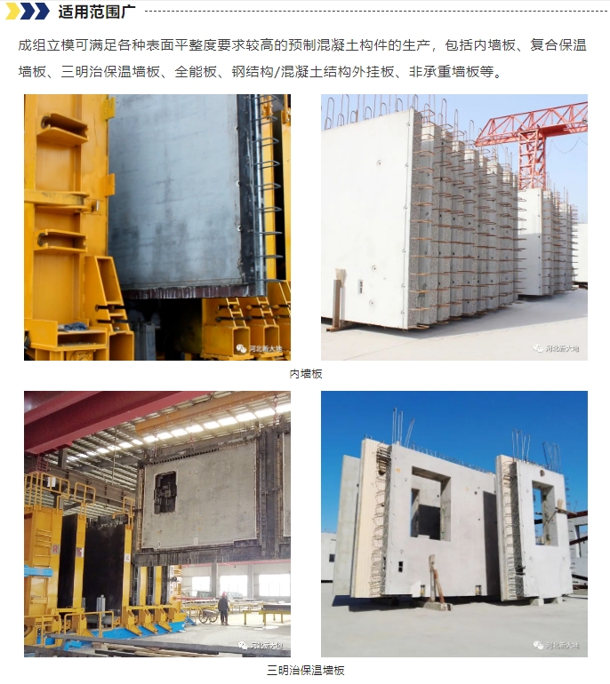 成組立模適用于生產(chǎn)縱肋疊合體系的內、外墻板,灌漿套筒體系的內、外墻板、非承重內隔墻板,鋼結構建筑外掛墻板,混凝土結構外掛墻板,全能板等表面要求光滑的預制混凝土構件生產(chǎn)。